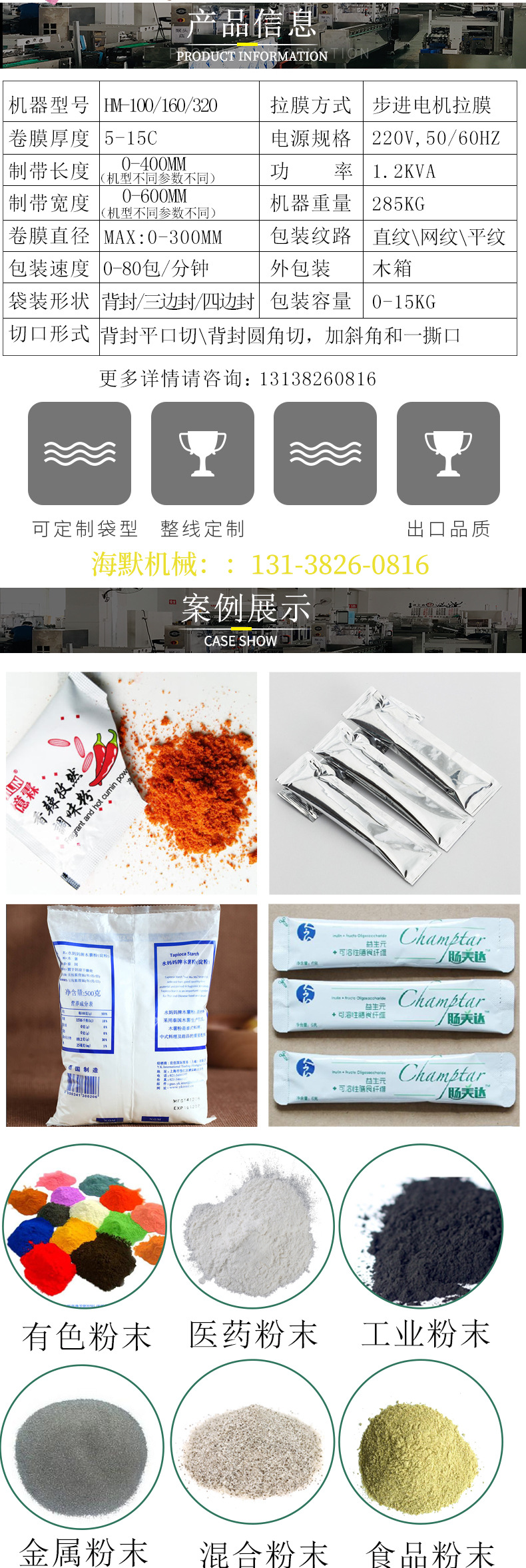 詳細(xì)信息 訂貨號粉末包裝機(jī) 加工定制是 貨號全自動粉末包裝機(jī) 功能殺菌、干燥,打包,灌裝,計(jì)量,封口,充填,粉末包裝機(jī),打碼、噴碼 品牌海默機(jī)械 型號全自動粉劑包裝機(jī) 電壓220(V) 功率1.4(Kw) 包裝膜寬Max.320(mm) 制成袋尺寸40-200(長)*50-150(寬)(mm) 包裝速度5-65(袋/分鐘) 重量300(kg)