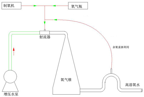 氧氣錐是一種特殊的壓力容器。它的主要功能就是在氣液充分混合的條件下,增加壓力來迫使氣體克服水的表面張力而被動溶解。因此氧氣錐要與增壓泵、射流器等設(shè)備配套使用。氣源采用制氧機或氧氣瓶(氧氣純度大于90%)