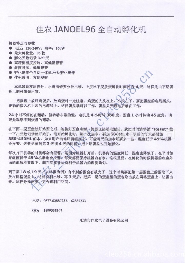 詳細(xì)信息 加工定制否 適用對象雞,鴨,鵪鶉,鴿 用途孵化設(shè)備 品牌JANOEL 型號JANOEL96 外型尺寸51*43*52CM 包裝說明單臺紙質(zhì)饈包裝 控溫范圍常溫至40度 類型孵化機 產(chǎn)品類型全新 售后服務(wù)ok 產(chǎn)品規(guī)格96枚 商品描述