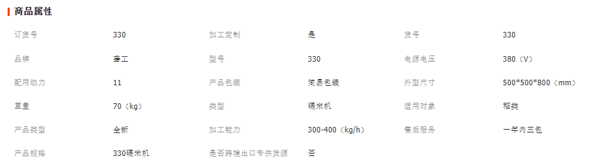 型號(hào)產(chǎn)量(kg/h) 動(dòng)力(kw) 機(jī)重(kg) 外形尺寸(mm) 330立式碾米機(jī) 300-4007.5-11 70 500x500x800