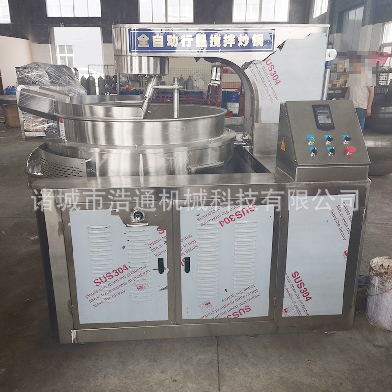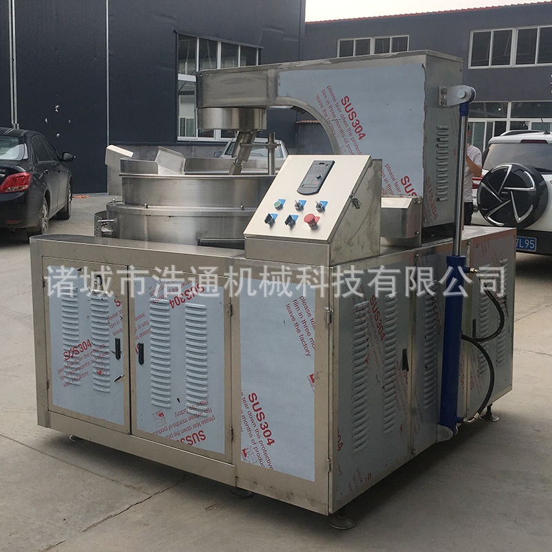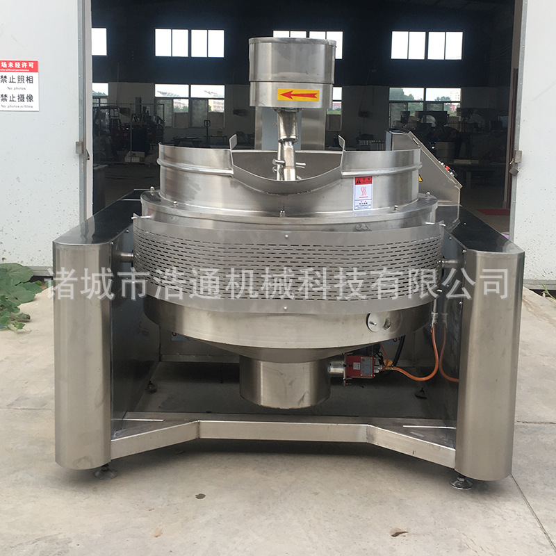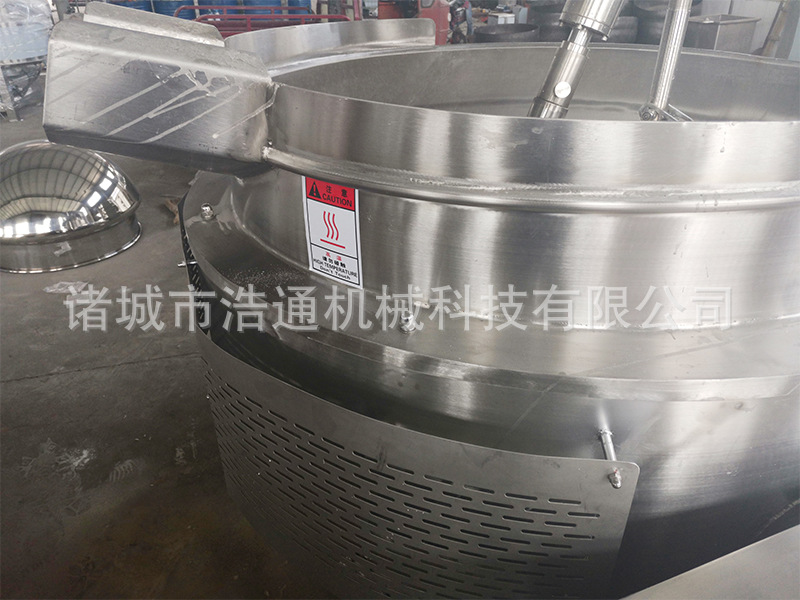 本產(chǎn)品鍋體為一次沖壓成型的球形不銹鋼鍋體,采用燃?xì)饧訜嵝问?,外保溫層采用硅酸鋁材質(zhì),耐火耐高溫,保證加熱能量不損耗;攪拌方式采用特殊的傾斜式傳動,使用的行星式攪拌器與鍋體充分接觸,多個攪拌齒,實現(xiàn)傳動公轉(zhuǎn)與自轉(zhuǎn)的不整數(shù)傳動比,使鍋內(nèi)無攪拌死角。使用先進(jìn)的傳動與密封結(jié)構(gòu),使傳動部分與鍋內(nèi)潔凈、衛(wèi)生。采用變頻調(diào)速動力,運行更平穩(wěn)。本機(jī)采用全自動液壓翻鍋運料,降低成本,是性能優(yōu)良的食品加工設(shè)備。