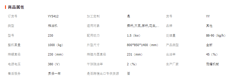 液壓榨油機(jī)主要技術(shù)參數(shù)