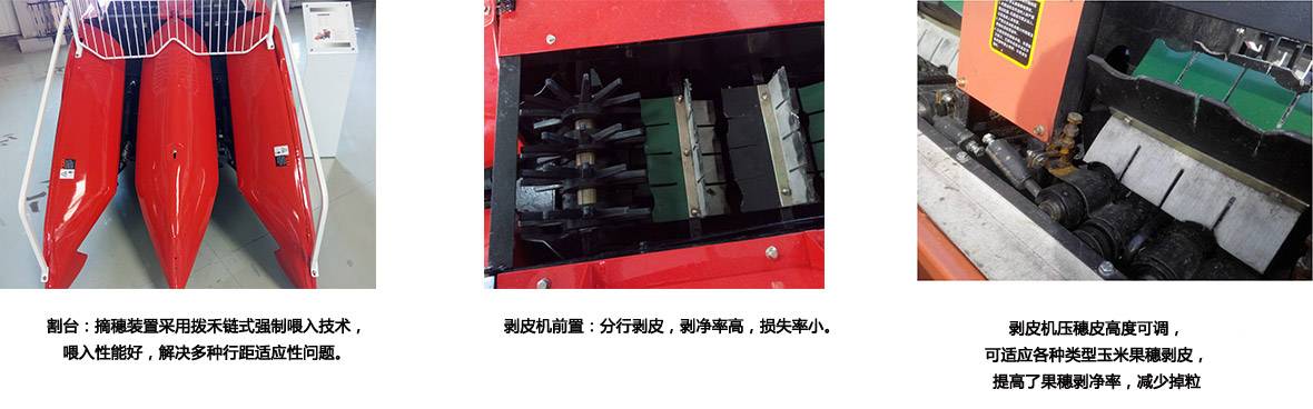 1、產(chǎn)品結構緊湊、機動性好,無需人工開道;可一次完成玉米作物的摘穗、輸送、果穗剝除苞葉、果穗收集裝箱、秸稈粉碎還田的作業(yè);