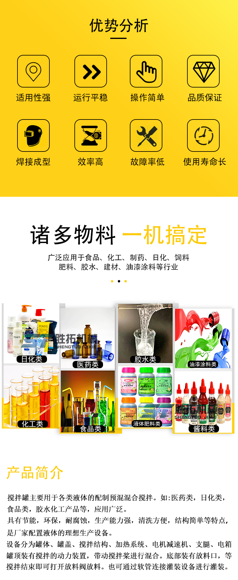 適用產(chǎn)品: 1.化妝品行業(yè): 護(hù)膚膏,剃須膏,洗發(fā)膏,牙膏,冷膏,冷曬霜,洗面奶,營養(yǎng)密,洗滌劑,洗發(fā)水、發(fā)膏、護(hù)發(fā)素,精華液,保濕霜,護(hù)手霜等。 2.日化: 洗衣液生產(chǎn),洗手液,潔廁凈,汽車玻璃水等。 3 .制藥工業(yè): 乳膠,乳劑,藥膏(油膏),口服糖漿,口服液等。 4.食品工業(yè): 醬類,乳酪,營養(yǎng)液,嬰兒食品,巧克力,糖類等。