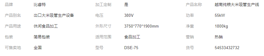 濟南比睿特機械設備有限公司專業(yè)生產(chǎn)可食用大米吸管加工生產(chǎn)設備,相比于普通的吸管工具具有工藝獨特,配置合理,自動化程度高,性能穩(wěn)定,環(huán)保無污染,也可直接使用,該吸管在熱飲中能堅持兩到三個小時,在冷飲中堅持時間更長,經(jīng)過品嘗該吸管口感酥脆有大米鍋巴的味道。