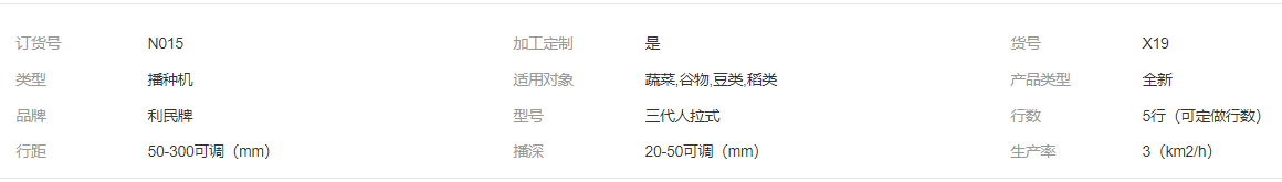 | 三壟六行鋪三膜一體機 拖拉機帶動式蘿卜白菜洋蔥菠菜芹菜播種機點擊購買¥7500 | 圣東三代人拉手推式5行播種機 開溝 施肥 播種 鎮(zhèn)壓 行距可調(diào)點擊購買¥5999 | 農(nóng)用人拉式小型播種機 多功能一體機 手推式多功能五行一體機點擊購買¥5999 | ||||
