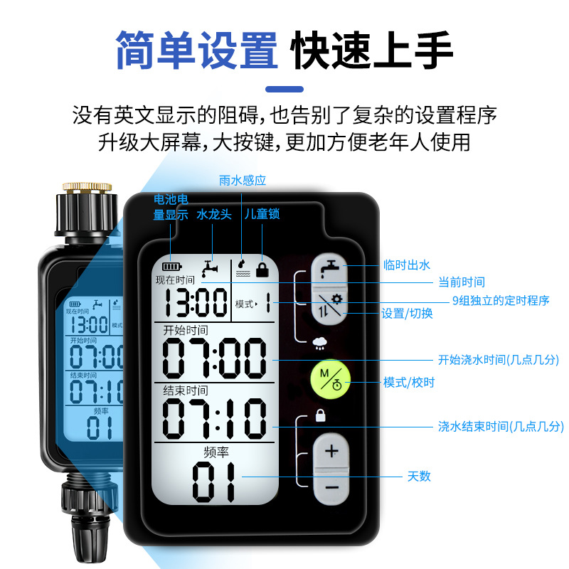 中文大屏定時澆花澆水器智能控制器灌溉噴頭滴灌噴淋系統(tǒng)雨感控制