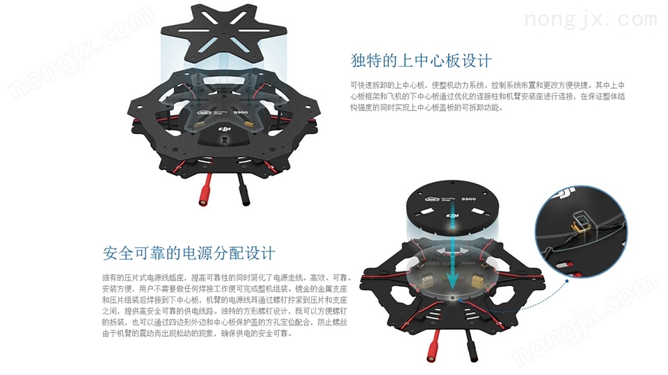 S900 采用 V 型 6 旋翼設(shè)計(jì),主要結(jié)構(gòu)部件均采用質(zhì)量強(qiáng)度比*的碳纖維復(fù)合材料,在保證機(jī)身結(jié)構(gòu)強(qiáng)度、剛度的同時(shí)大幅減輕重量。機(jī)身結(jié)構(gòu)的系統(tǒng)性能兼容 DJI WKM/A2 多旋翼飛控。快速的響應(yīng)頻率使你獲得流暢的操縱感,更輕的質(zhì)量使飛機(jī)的續(xù)航時(shí)間進(jìn)一步加長(zhǎng)。
