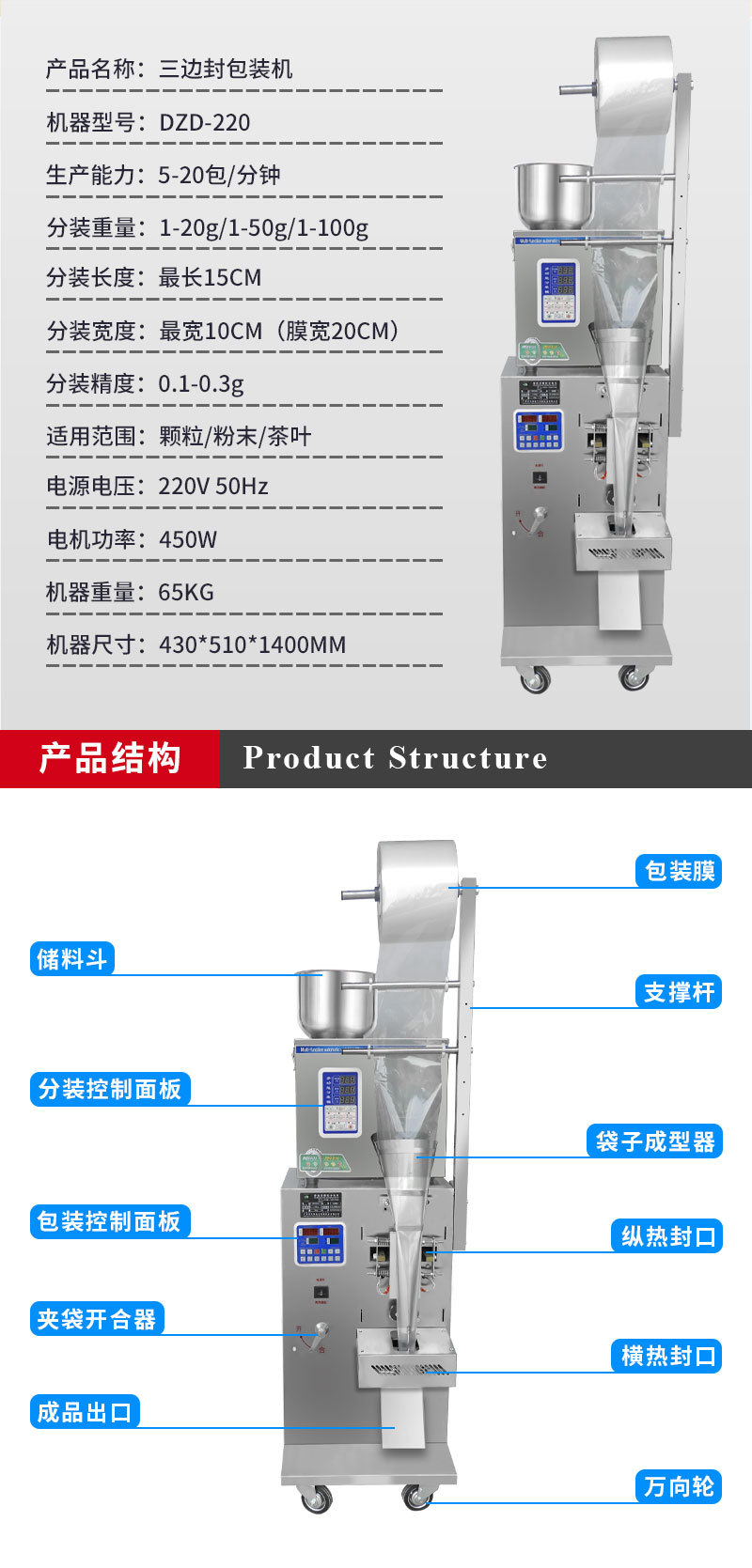 廣州大祥DZD-220小型自動(dòng)定量粉末打包機(jī) 三邊封袋泡茶顆粒包裝機(jī)