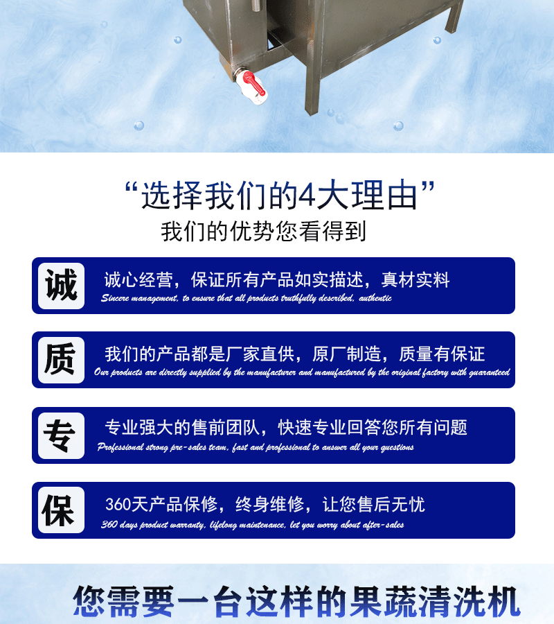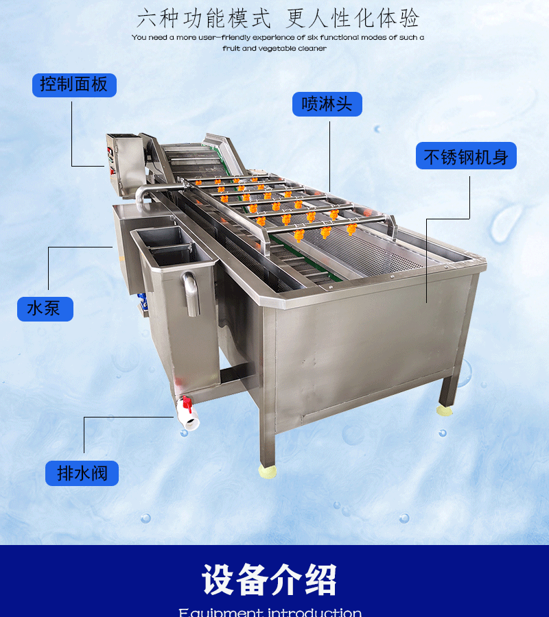 1、設(shè)備除電機(jī)、軸承等標(biāo)準(zhǔn)件外均采用不銹鋼SUS304/2B材料制作,完全符合出口食品衛(wèi)生要求。設(shè)備中設(shè)有氣泡發(fā)生裝置,使物料呈翻滾狀態(tài),具有洗潔凈高、節(jié)能、節(jié)水、設(shè)備穩(wěn)定可靠等特點(diǎn)。