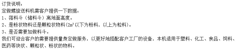 5、外形尺寸:具體根據(jù)工程需要來(lái)。 為能夠便于清理殘料設(shè)計(jì)成:螺旋可以反轉(zhuǎn)排料、料管下端有閘門放料、整條螺旋方便卸、裝、清洗等。